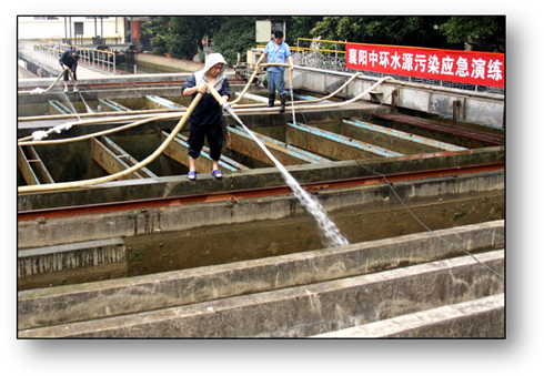 5月28日上午,襄阳中环球王会平台米公水厂开展了一场“水源污染应急演练”。“演练”通过该厂位“汉江取水口水源地突遭不明原因污染”,城市供水“被迫紧急停止” …… 。图为演练过程中,米公水厂员工利用多支高压水枪,对水厂“被污染水池池面、管道” 等进行全面、彻底的清洗。“演练” 进一步提高了企业员工处置突发事件的思想意识和能力。