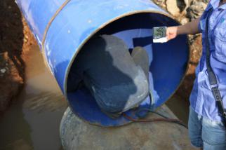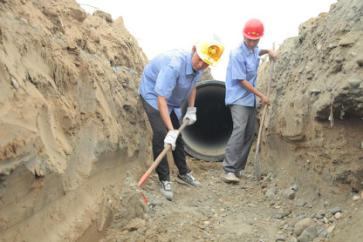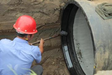 一截管道安装完毕,王俊钻进了管道中,沿着新铺设的这截6米长的管道,一边爬一边观察,检查管道接口处的皮圈是否有缝隙,有没有受挤压而外露。见皮圈处平整无缝,王俊才放心地爬了出来。尽管当天气温不高,但管道中密不透风,让人喘不过气,一趟爬下来,王俊的脑门上布了一层细细的汗珠。